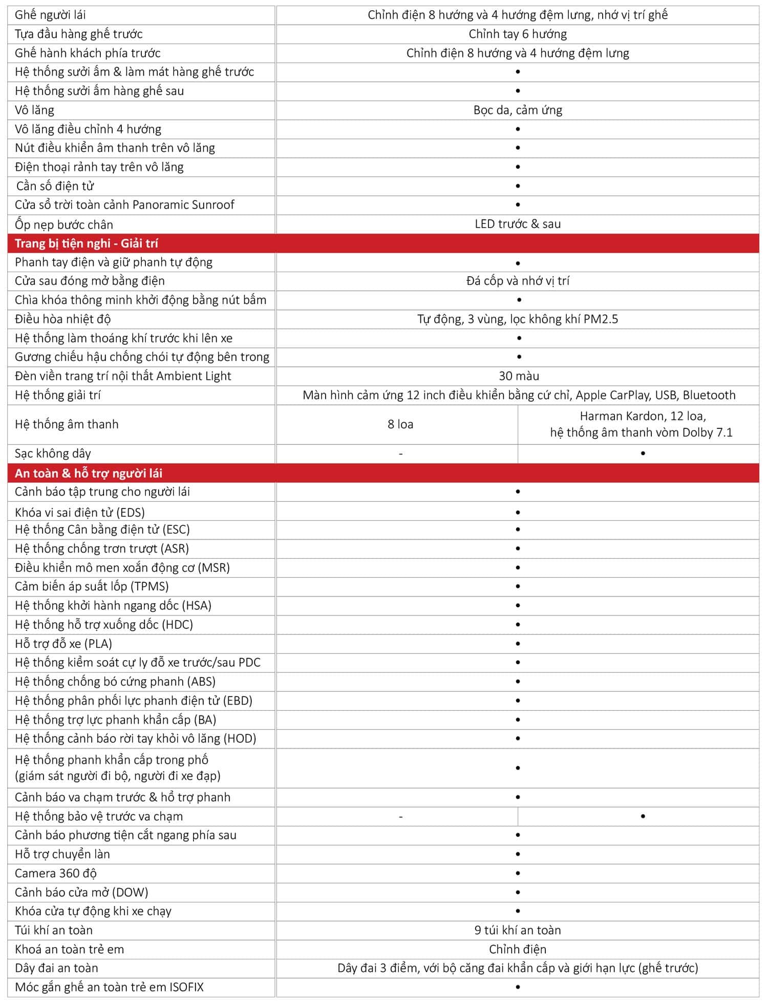 Ghế trước chỉnh điện 8 hướng; Đệm hơi tựa lưng chỉnh điện 4 hướng; Nhớ 3 vị trí ghế lái; Làm mát và sưởi ấm ghế trước; Gối tựa đầu chỉnh 6 vị trí.