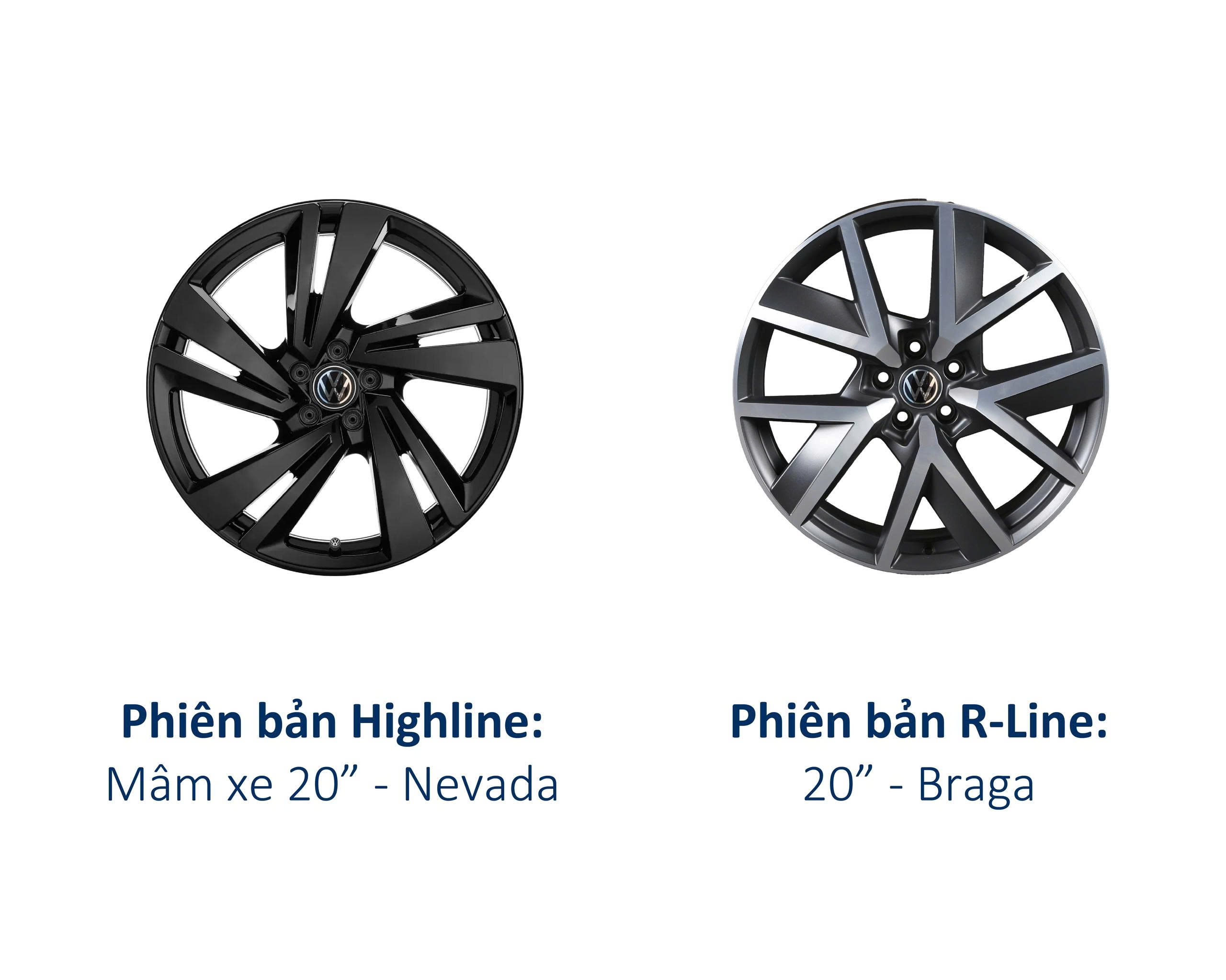 Mâm xe hợp kim kích thước 19 inch (Elegance) và 20 inch (Luxury ,Hightline và R-Line) góp phần hoàn thiện dáng vẻ thể thao nhưng vẫn tinh tế. Các chi tiết như ốp vè bánh đen nhám, viền chrome dưới cửa và ốp cản sau càng làm nổi bật chất SUV Đức cao cấp trên từng góc nhìn.