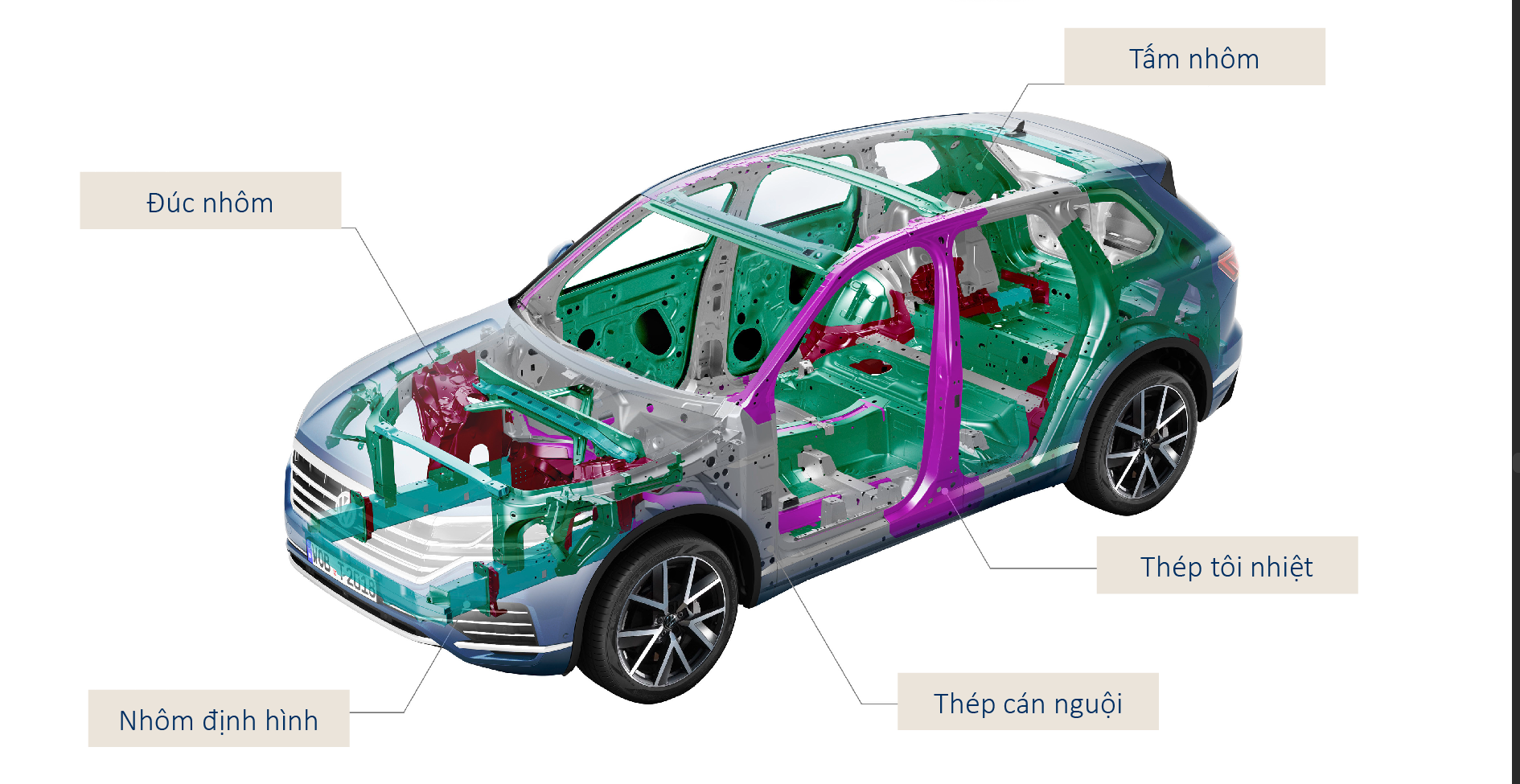 - Hợp kim nhôm có độ cứng tốt, khả năng chống xoắn cao, ngoài ra các cấu kiện nhôm (aluminum profile) và nhôm đúc (cast aluminium parts) kết hợp với thép tạo hình nóng (hot formed steel) tạo nên độ cứng vững cho khoang hành khách, sự an toàn và khả năng vận hành ổn định cho xe Touareg.