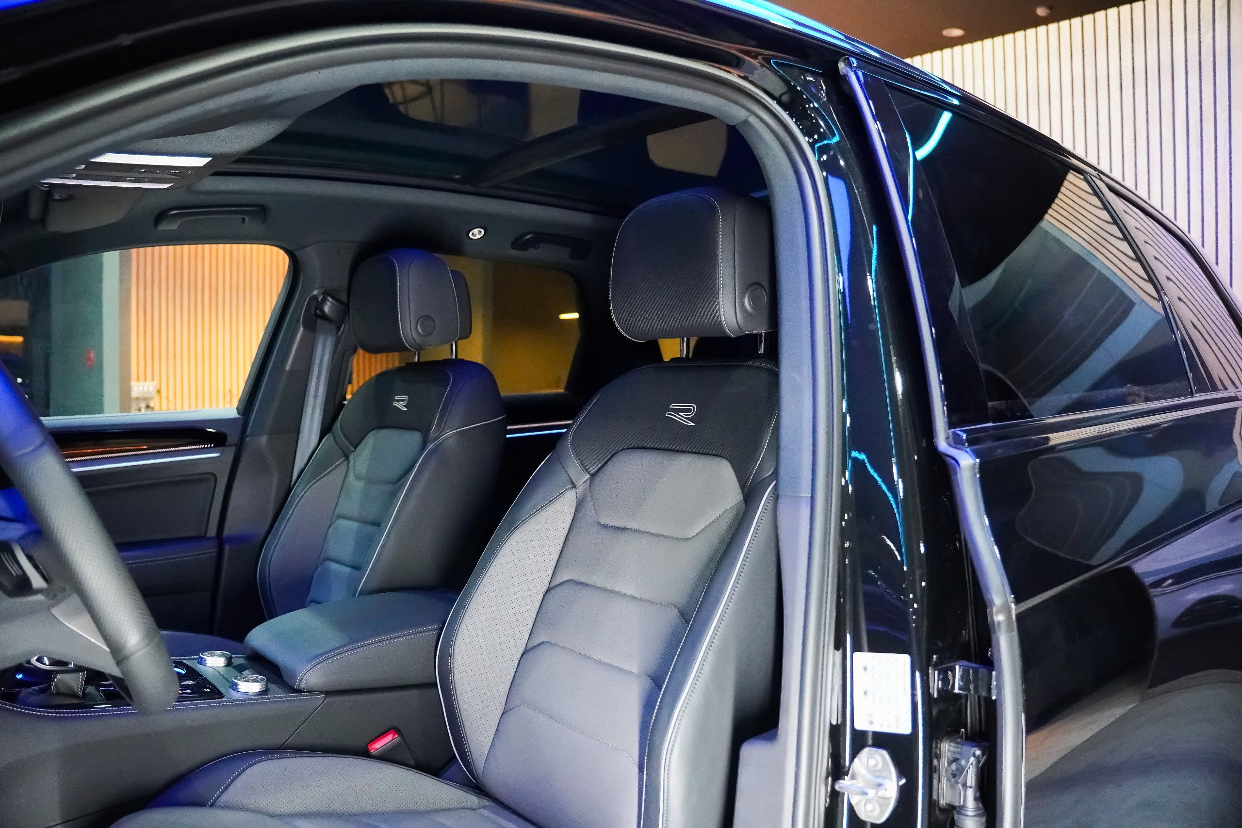 - Chất liệu ghế Da Varenna – Ghế phía trước vân carbon, có logo R-Line